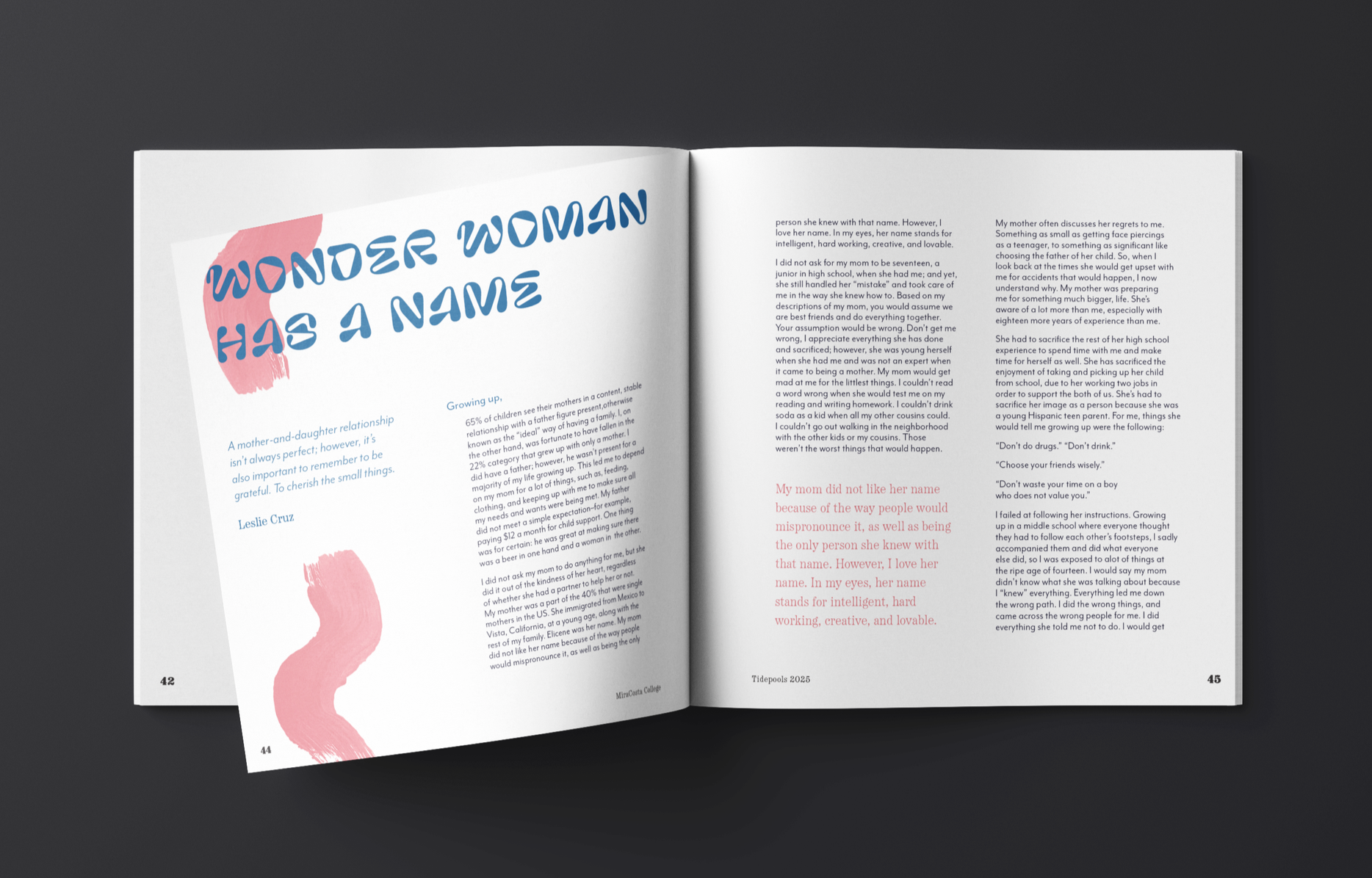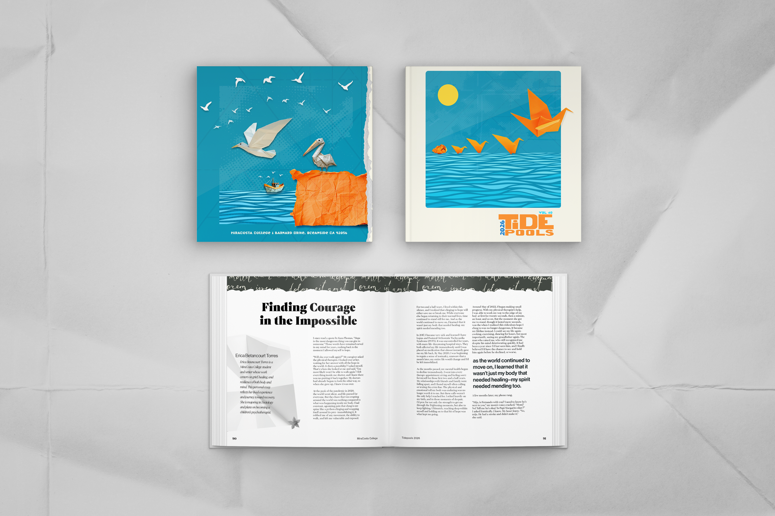 Tidepools is a publication at MiraCosta College which features poetry, non fiction essays, art and fiction writing from students and faculty at MiraCosta College. The 2025 issue focuses on honoring grandparents, parents, and overcoming obstacles.